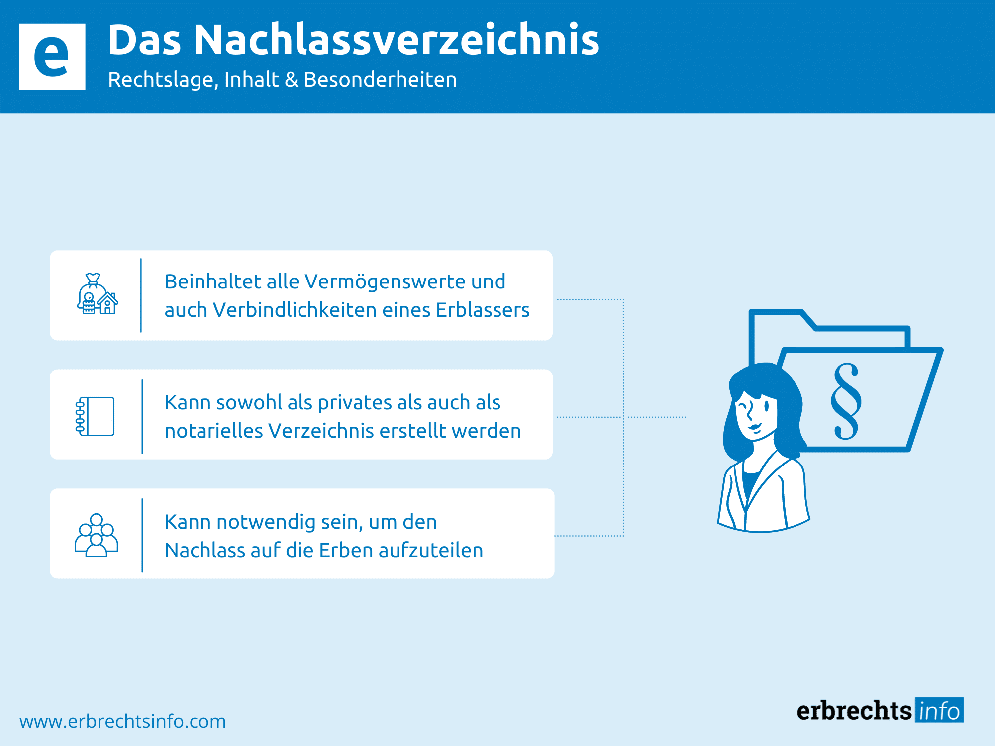 Dazu gehören z. B. alle Immobilien, Wertpapiere, Kunstgegenstände etc sowie auch die noch offenen Schulden des Erblassers und die Beerdigungskosten. Hierbei kann ein derartiges Verzeichnis sowohl von den gesetzlichen oder anderen Erben, den Gläubigern des Erblassers oder auch von Vermächtnisnehmern eingefordert werden.