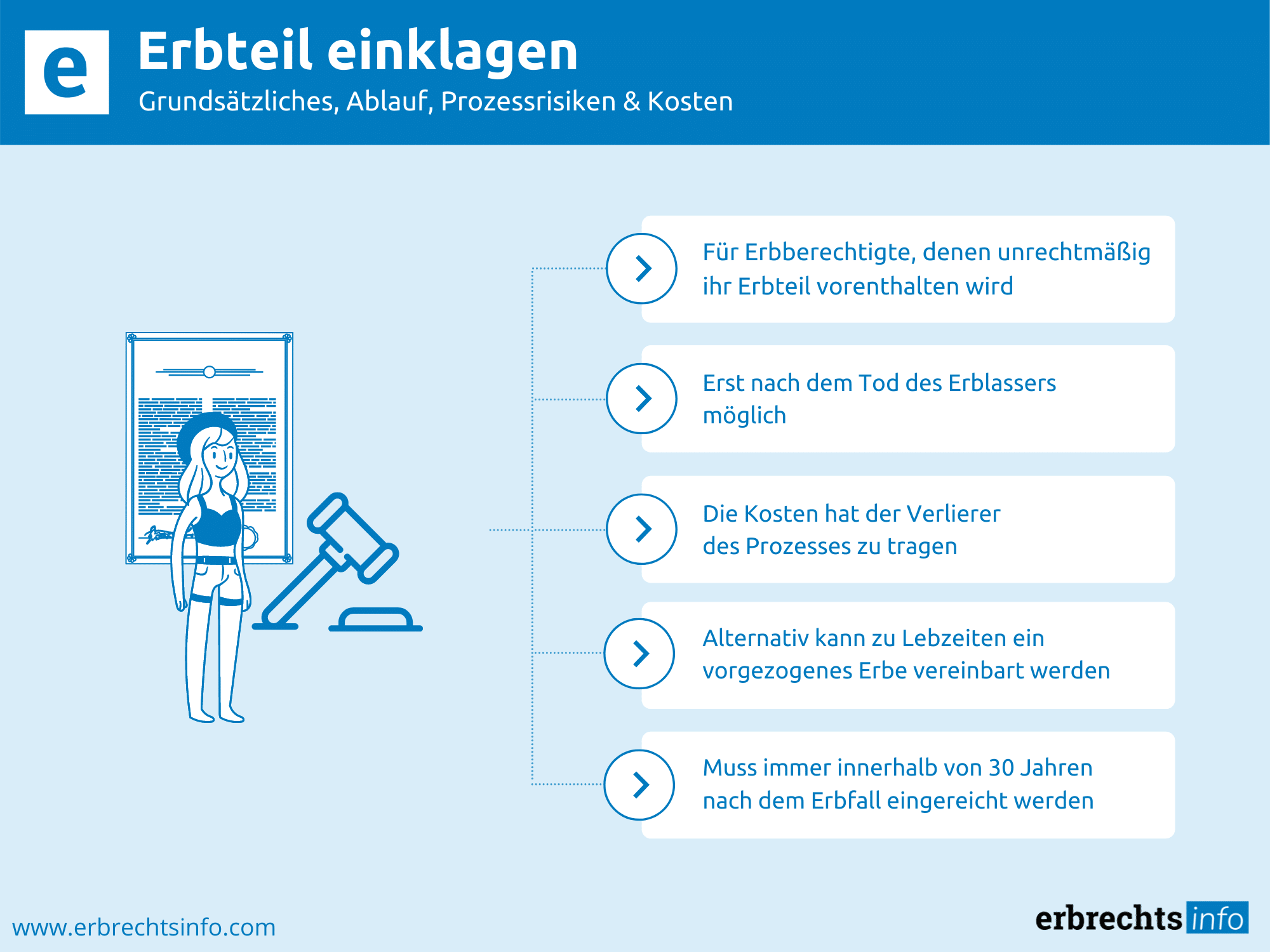 Für den Fall, dass man nach dem Tod des Erblassers den eigenen Erbteil einklagen möchte, kann man hierzu eine zivilrechtliche Klage mit Hilfe eines Anwalts anstrengen. Dabei wird das zuständige Gericht dann zunächst entscheiden, ob ein Anspruch auf den Erbteil besteht und für den Fall, dass dieser berechtigt ist, die übrigen Erben zu einer Auszahlung oder auch Herausgabe des eingeklagten Erbteils verpflichten.