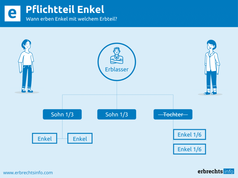Gibt es einen Pflichtteil für Enkel? Anders als die Kinder des Erblassers sind dessen Enkel nur unter bestimmten Umständen pflichtteilsberechtigt. Nach der gesetzlichen Erbfolge ohne Testament sind Enkel nur dann Erben, wenn der Erblasser keine Kinder hinterlässt. Der Pflichtteil für Enkel stellt in der Praxis eher eine Ausnahme dar. Wie hoch ist der Pflichtteil beim Erbe? Können Enkel den Pflichtteil einklagen? Kann man Enkel vom Pflichtteil ausschließen oder einen Pflichtteilsverzicht vereinbaren? In diesem Artikel beantworten wir Ihnen alle Fragen und Sie erfahren, wann ein Enkel den Pflichtteil bekommt.er