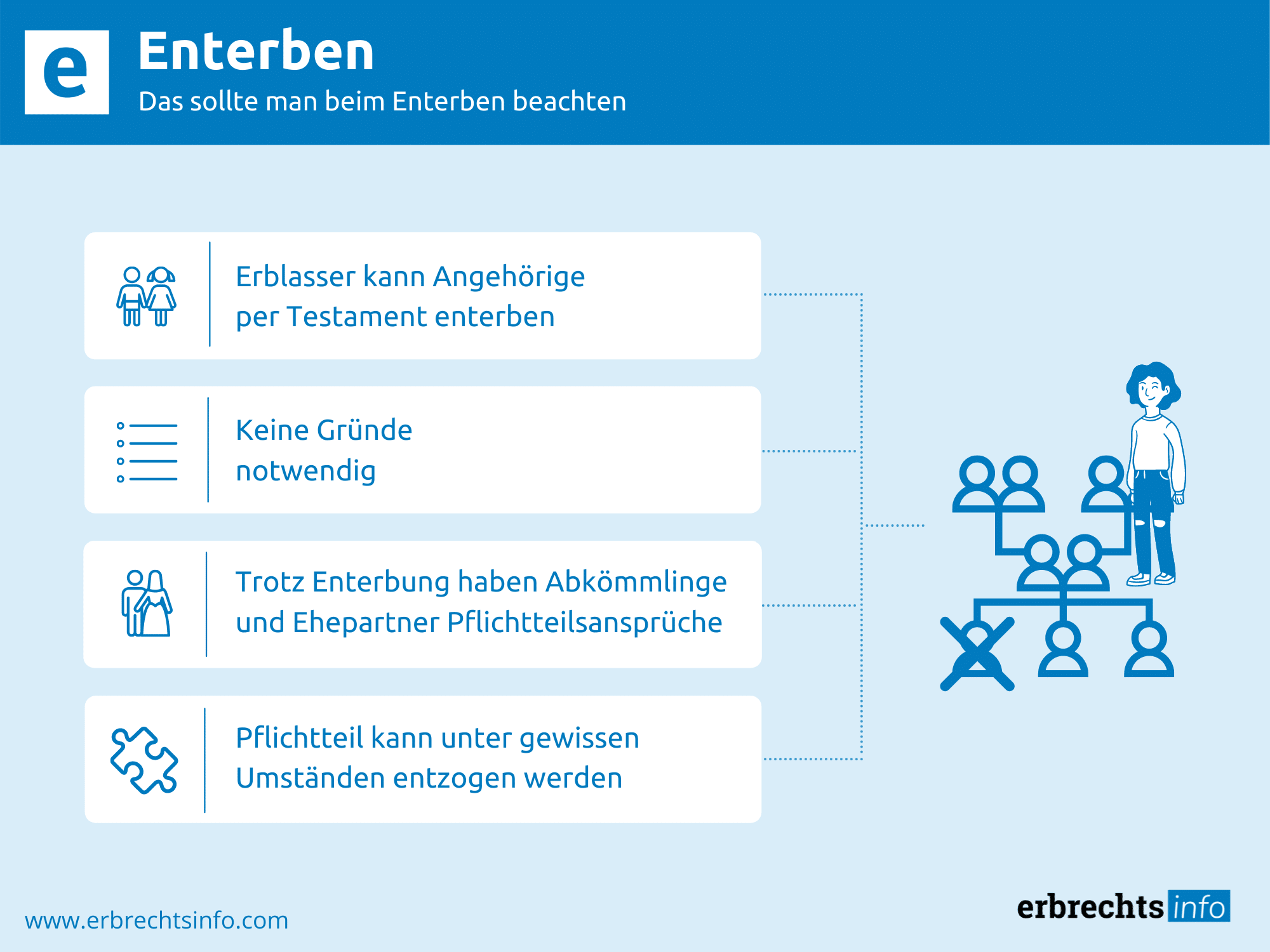 Jeder Erblasser kann frei entscheiden, wie er sein Vermögen im Todesfall verteilt und oder Angehörige enterben möchte. Mithilfe eines Testaments kann er Angehörige enterben oder begünstigen. Somit kann er eine Person von der Erbfolge ausschließen, was wiederum als Enterbung gilt.